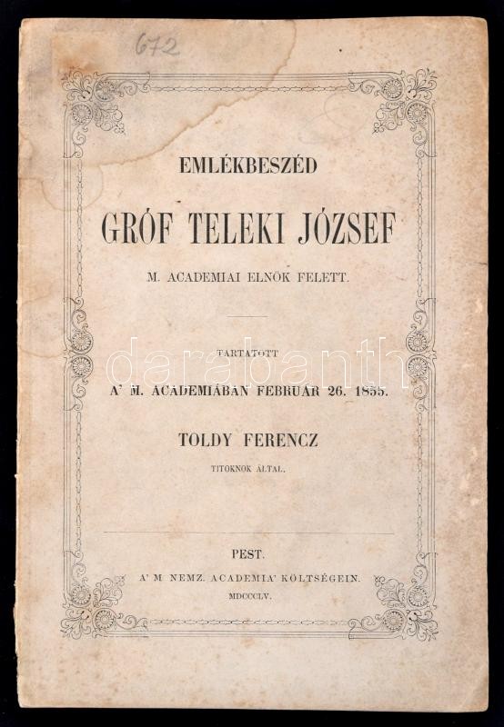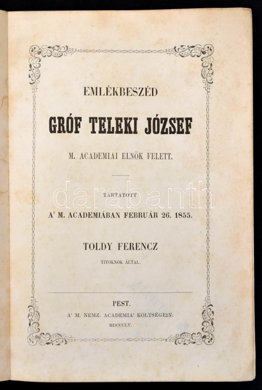 Toldy Ferenc - Emlékbeszéd gróf Teleki József M. Academiai elnök felett. Tartatott a' M. Academiában február 26. 1855. - - titoknok által.