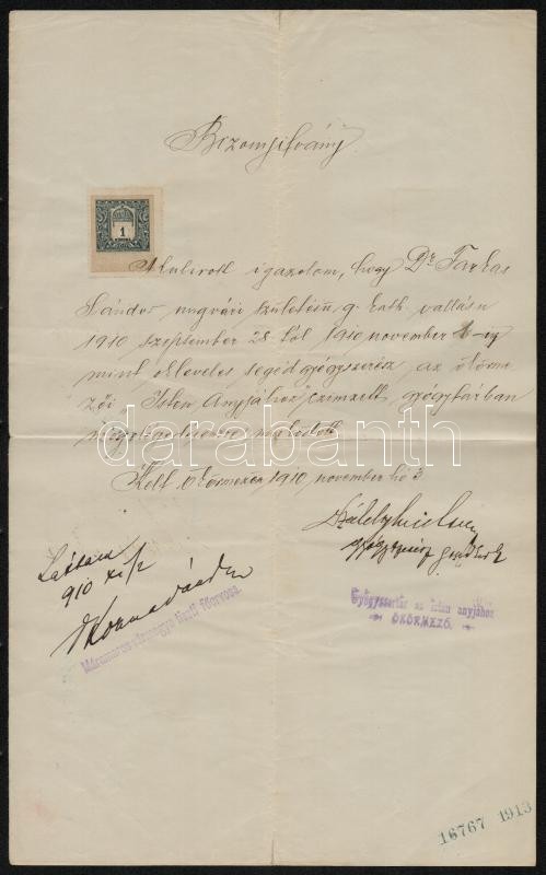 1910 Az ökörmezői (Kárpátalja) "Gyógyszertár az Isten Anyjához" tulajdonosának okmánybélyeggel ellátott, kézzel írt bizonyítványa dr. Farkas Sándor segédgyógyszerész részére