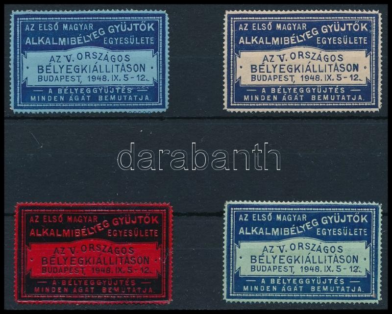 Leírás: 1948 Első Magyar Alkalmibélyeg Gyűjtők Egyesülete 4 db klf színű levélzáró / 4 different labels