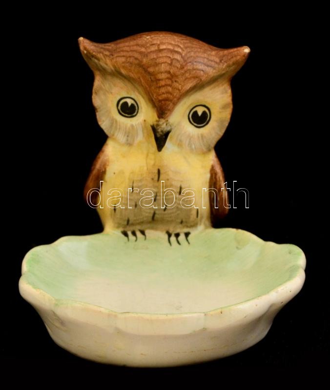 Leírás: Bodrogkeresztúri porcelán bagoly tálkával, kézzel festett, jelzett, kis kopásnyomokkal, m: 7 cm.