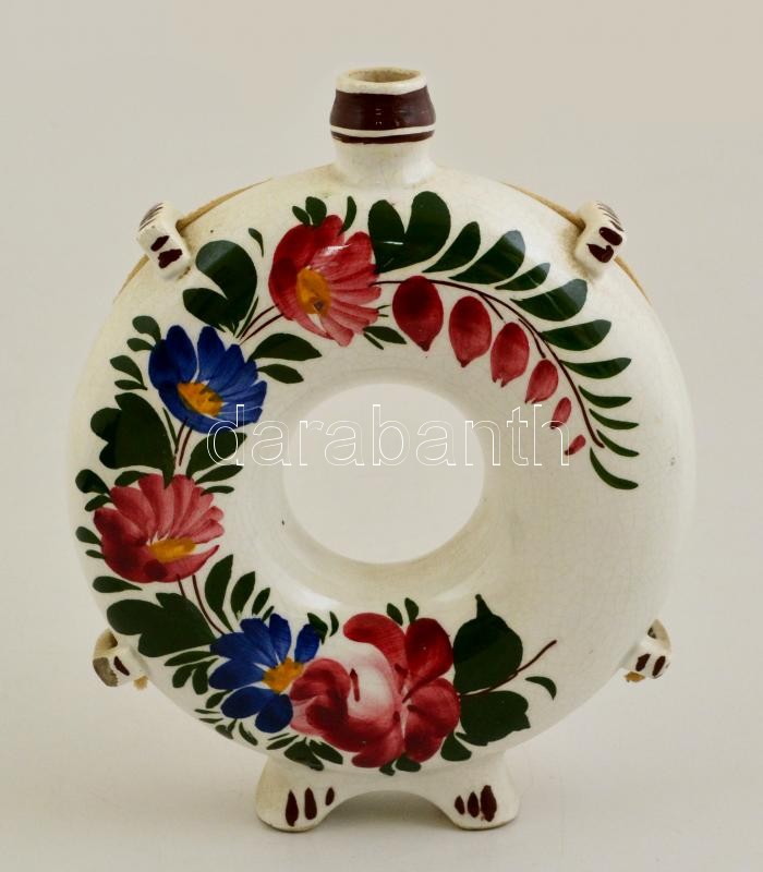 Leírás: Hollóházi riolit kulacs, kézzel festett, jelzett, lepattanásokkal, m: 21,5 cm