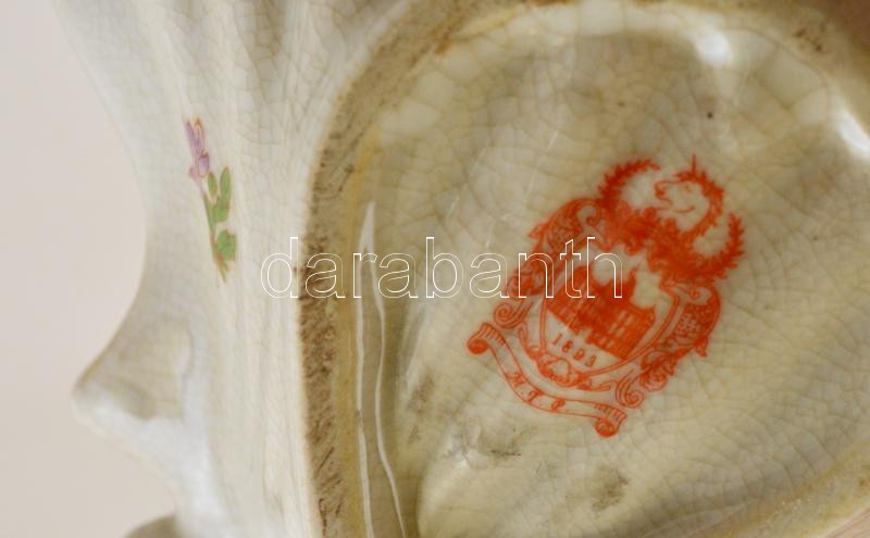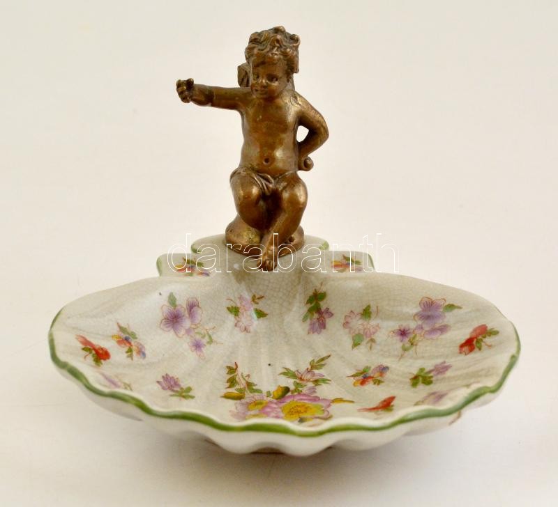 Leírás: MTP (modern) fajansz kagylós tálka fém angyalkás rátéttel, kézzel festett, jelzett, kis kopásokkal, m: 11,5 cm