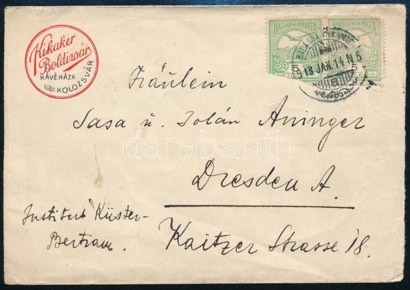 Leírás: 1913 Kikaker Boldizsár kávéháza, Kolozsvár, feliratos boríték, Drezdába megküldve