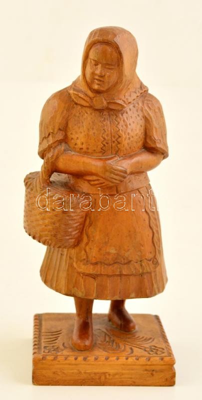 Leírás: Asszony kosárral, faragott fa szobor, Fodor jelzéssel, m: 23 cm