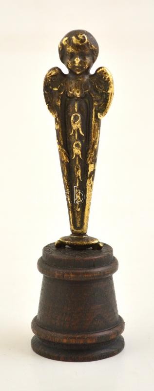 Leírás: Réz angyal szobrocska fa talapzaton 14 cm / copper angel statue.