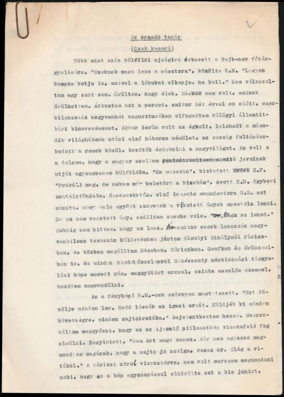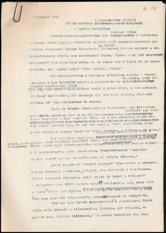 Leírás: cca 1960 Boldizsár Iván (1912-1988) író, újságíró kézzel kijavított gépirata. Visszaemlékezések, a Rajk per. Kb 30 oldal.