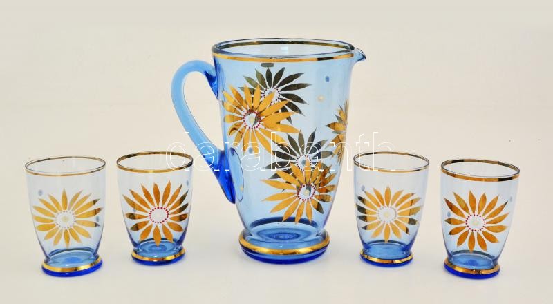 Leírás: Virágmintás üveg vizes kancsó, 4 db pohárral, kis kopásnyomokkal, m: 10 és 20 cm