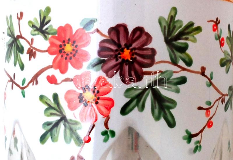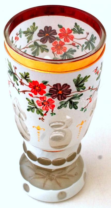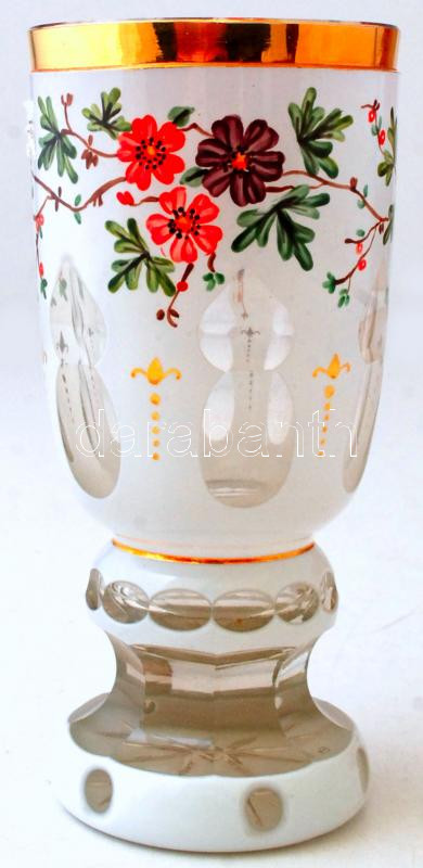 cca 1860 Emlékpohár, formába fúvott üveg, kétrétegű, hámozott, csiszolt, zománc festett, aranyozott peremmel, m:16cm / circa 1860 Memorial Cup, mold blown glass, double-layer, peeled, polished, painted enamel, gold rim, m: 16cm