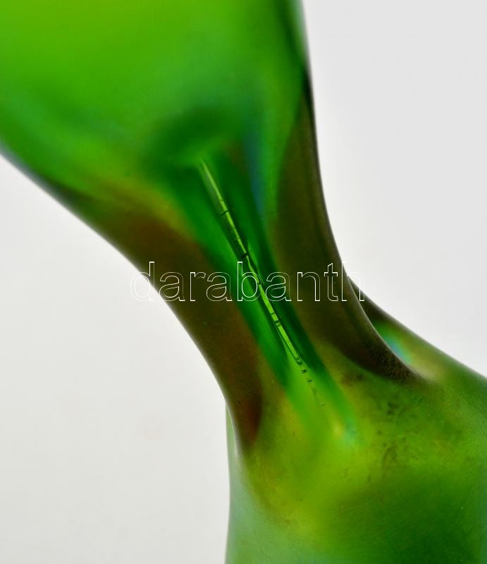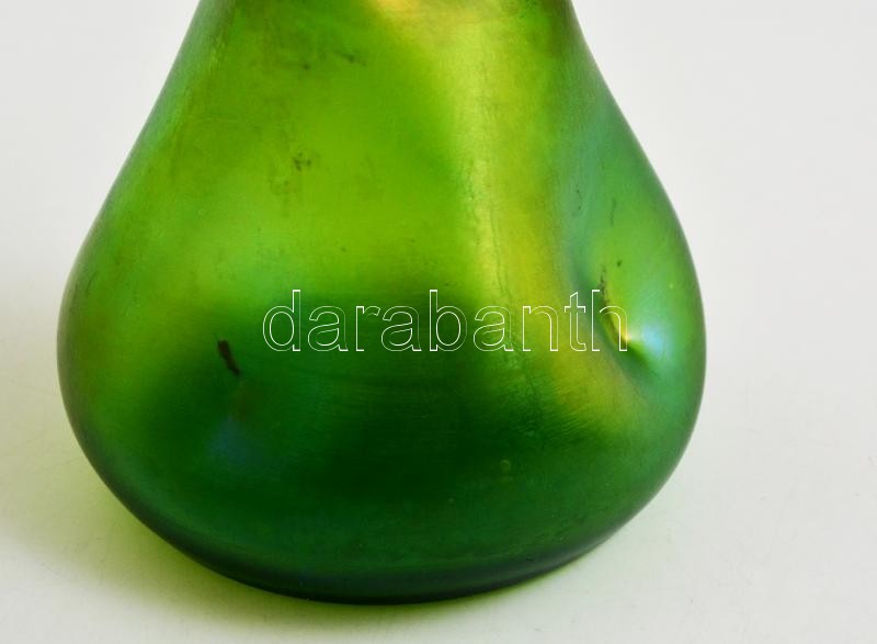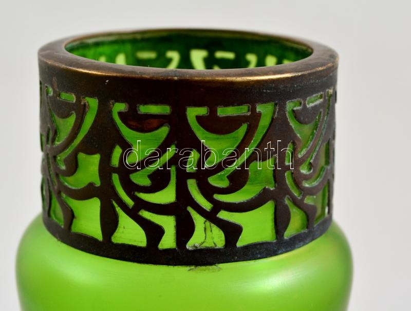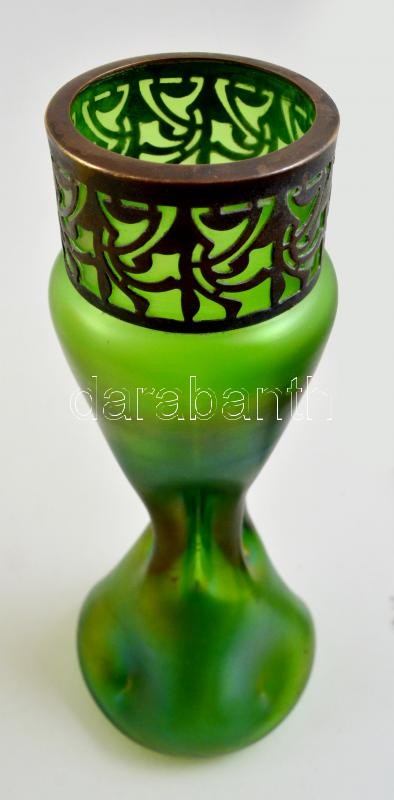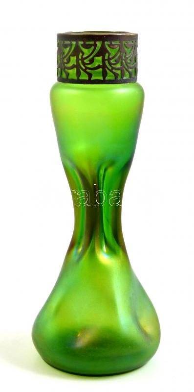 cca 1900 Johann Lötz Witwe, Klostermühle irizáló díszváza, tetején réz montírozással, jelzés nélkül, hibátlan, m: 25 cm /