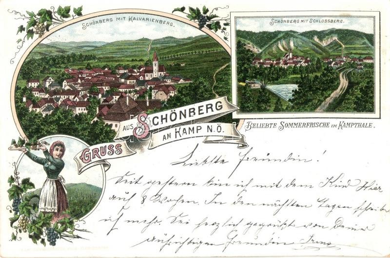 Leírás: 1896 (Vorläufer!) Schönberg am Kamp, Kalvarienberg, Schlossberg / calvary and castle, folklore. Art Nouveau, litho