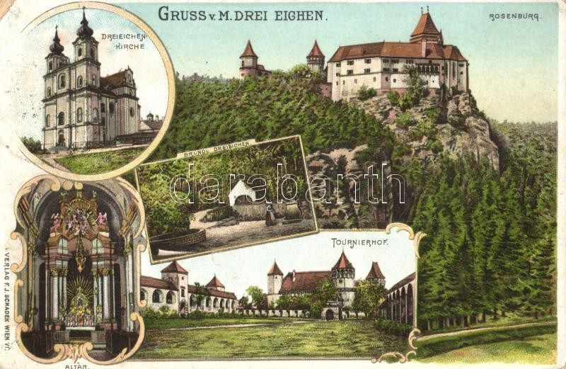 Leírás: Maria Dreieichen, Kirche, Rosenburg, Tournierhof, Altar, Bründl / church, castle, altar, interior, spring. Art Nouveau, litho (Rb)