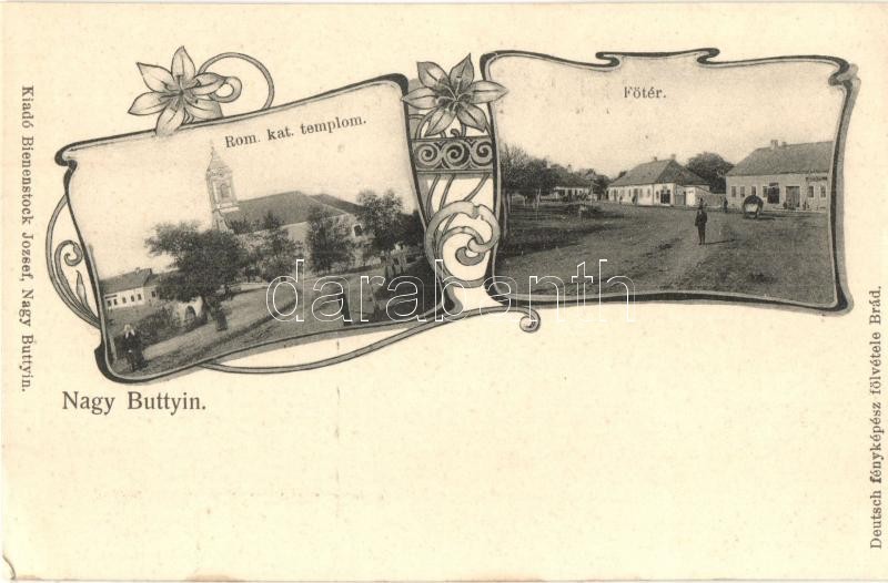 Buttyin, Nagybuttyin, Buteni; Római katolikus templom, Fő tér, üzletek. Kiadó Bienenstock József, Deutsch fényképész felvétele / Roman Catholic church, main square, shops. Art Nouveau, floral (ázott sarok / wet corner)