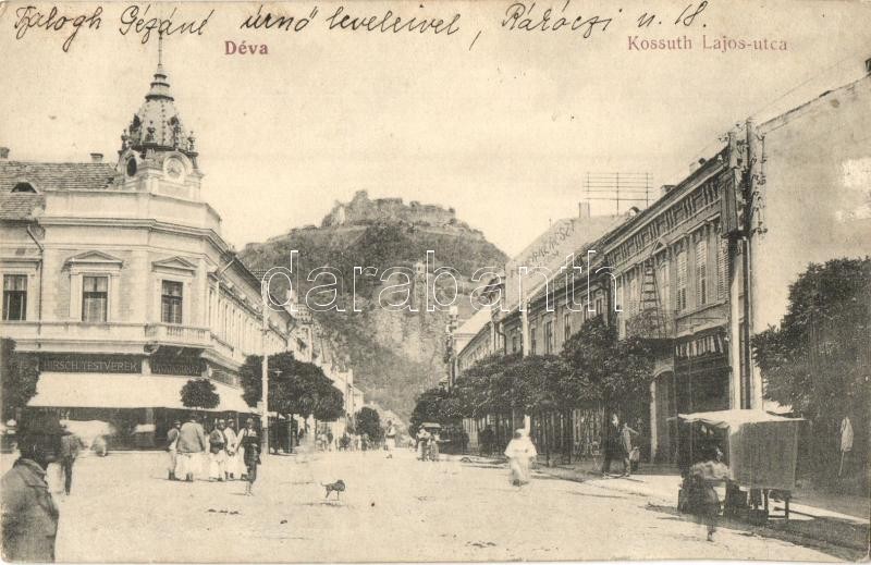 Déva, Deva; Kossuth Lajos utca, Hirsch Testvérek üzlete, Fehér Kereszt szálloda, létra, háttérben a vár. Kiadja Laufer Vilmos / street view, shops, hotel, ladder, castle (EK)