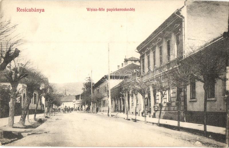 Leírás: Resicabánya, Resita; utcakép, Weisz-féle papírkereskedés, üzlet / street view, shop (EK)