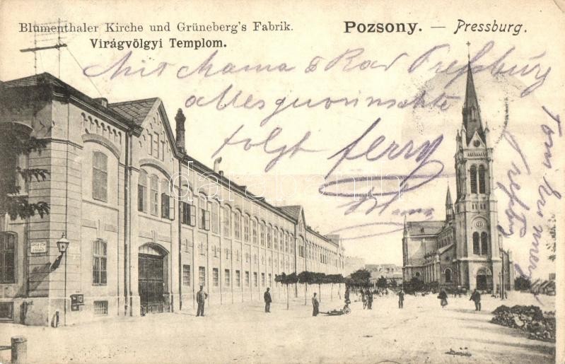 Leírás: 1900 Pozsony, Pressburg, Bratislava; Virágvölgyi templom, Grüneberg gyára / Blumenthaler Kirche, Fabrik / Kvetná dolina, church and factory (EB)