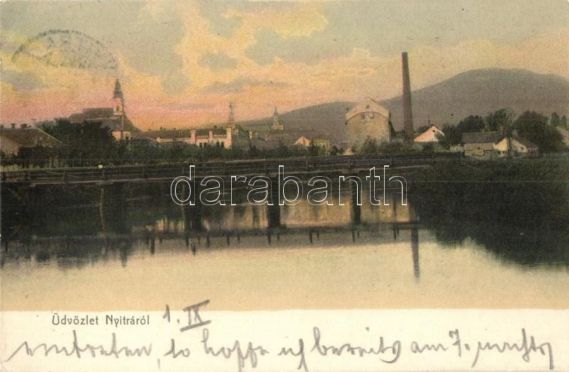 1907 Nyitra, Nitra; folyó, híd, gőzmalom / river, bridge, steam mill https://www.darabanth.com/hu/325-Gyorsarveres/325.0/Kepeslapok/Felvidek~2500006/1907-Nyitra-Nitra-folyo-hid-gozmalom-river-bridge-steam-mill~II1809332