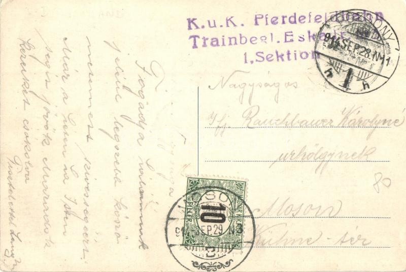 Leírás: 1914 Főrév, Ruzsinó, Oberufer, Prievoz, Ruzinov (Pozsony); Csáky kastély, utca / castle, street. Art Nouveau, floral + K.u.K. Pferdefeldbahn Trainbegl. Eskadr. No. 3. 1. Sektion (EK)