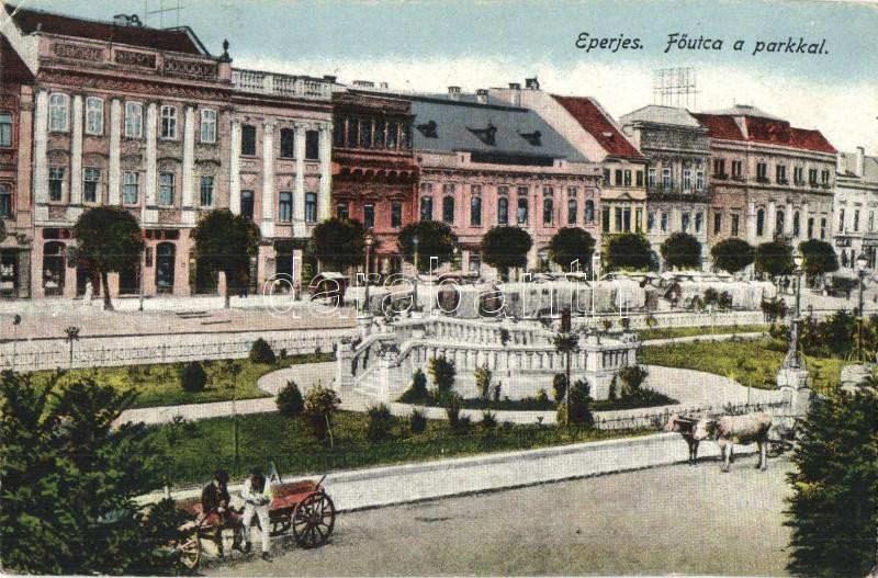 Eperjes, Presov; Fő utca a parkkal, Gyógyszertár, ökrös szekér, piaci árusok, üzletek. Stehr kiadása / main street with park, pharmacy, ox cart, market vendors, shops (EK)
