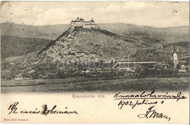 Leírás: Krasznahorkaváralja, Krásnohorské Podhradie; Vár, templom. Falvi Jenő kiadása / castle, church (EK)
