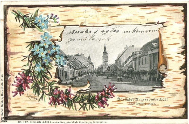 Nagyszombat, Tyrnau, Trnava; Alsó Hosszú utca. Horovitz Adolf No. 1267. Szecessziós litho keret / street view, Art Nouveau litho frame s: E. Döcker (kis szakadás / small tear)