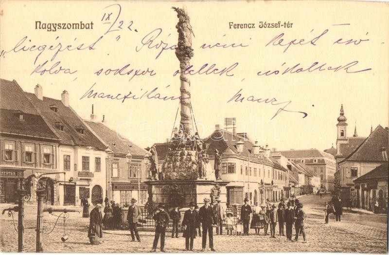Nagyszombat, Tyrnau, Trnava; Ferenc József tér, Szentháromság szobor, ... https://www.darabanth.com/hu/325-Gyorsarveres/325.0/Kepeslapok/Felvidek~2500006/Nagyszombat-Tyrnau-Trnava-Ferenc-Jozsef-ter-Szentharomsag-szobor-Gyogyszertar-uzletek-~II1808585