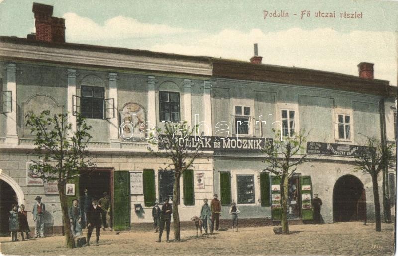 Podolin, Podolínec (Szepes, Zips); Fő utca, Mordavszky Károly, Pollák és Mocznik üzlete. Pollák és Mocznik saját kiadása / main square, shops, publisher's shop (EK)