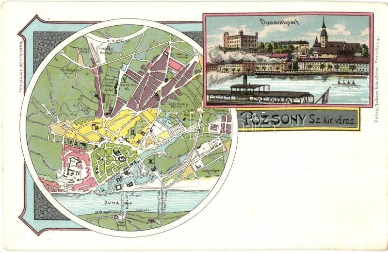 Leírás: Pozsony, Pressburg, Bratislava; Duna rakpart, térkép. Bediene dich allein / quay, map. Art Nouveau, litho