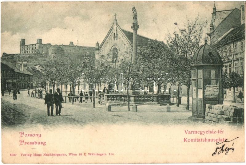 Leírás: Pozsony, Pressburg, Bratislava; Vármegyeház tér, templom, vár, Kertész Tódor reklámja egy hirdetőoszlopon, üzletek. Hans Nachbargauer kiadása / Komitatshausplatz / County Hall square, church, castle, shops, advertising column (EK)