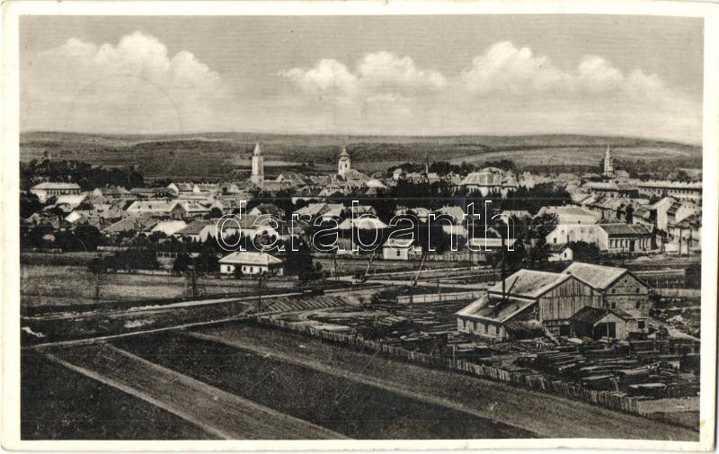 Rimaszombat, Rimavska Sobota; látkép, fűrésztelep, fatelep, sorompó, vasúti átkelőhely. Klein Géza kiadása / general view, sawmill, barrier, railway crossing