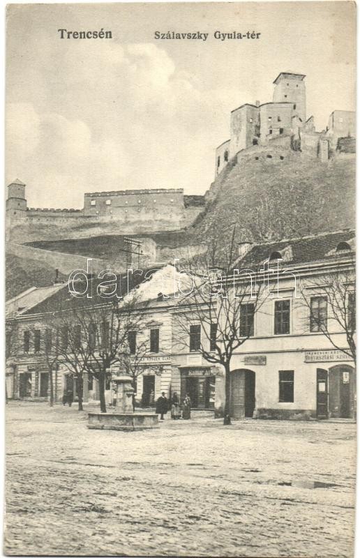 Leírás: Trencsén, Trencín; Szálavszky Gyula tér, Schweitzer, Kalmár üzlete, Fogyasztási Szövetkezet, háttérben a vár. Weisz Náthán kiadása / square, shops, cooperative shop, castle (EK)