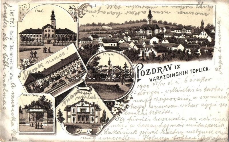 1900 Varasdfürdő, Warasdin-Töplitz, Varazdinske Toplice; Grad, Ulazu Perivj, Villa Bauer, Chineser / church, spring pavilion, villa. Rudolf Oesterreicher No. 1783. Art Nouveau, floral, litho (EK)