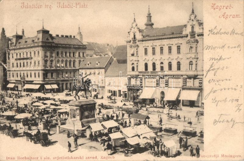 1901 Zagreb, Agram; Jelacicev trg. / square with market, monument, sho... https://www.darabanth.com/hu/325-Gyorsarveres/325.0/Kepeslapok/Horvatorszag-Delvidek~2500008/1901-Zagreb-Agram-Jelacicev-trg-square-with-market-monument-shops-of-Adolf-Bondy-F-Rudovits~II1808454
