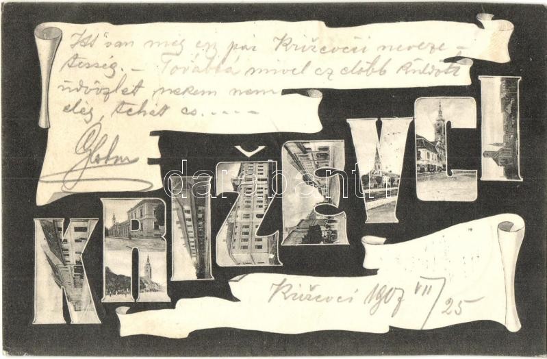 Leírás: Kőrös, Krizevci, Kreuz; mozaiklap, rajta: Vasútállomás, Görögkatolikus templom, Fő utca, stb. / multi-view postcard with: railway station, churches, main street, etc. (EK)