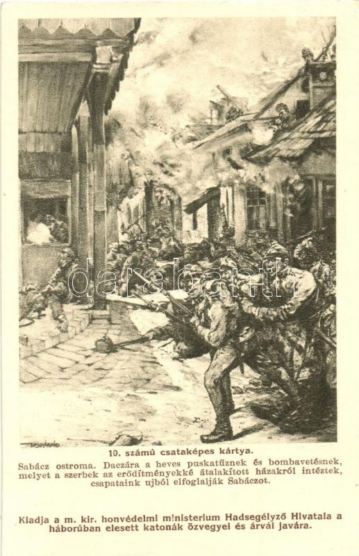 Leírás: 10. számú csataképes kártya. Sabácz ostroma. Hadsegélyező Hivatal kiadása / Battle of Sabac, WWI Austro-Hungarian military s: Basch Árpád