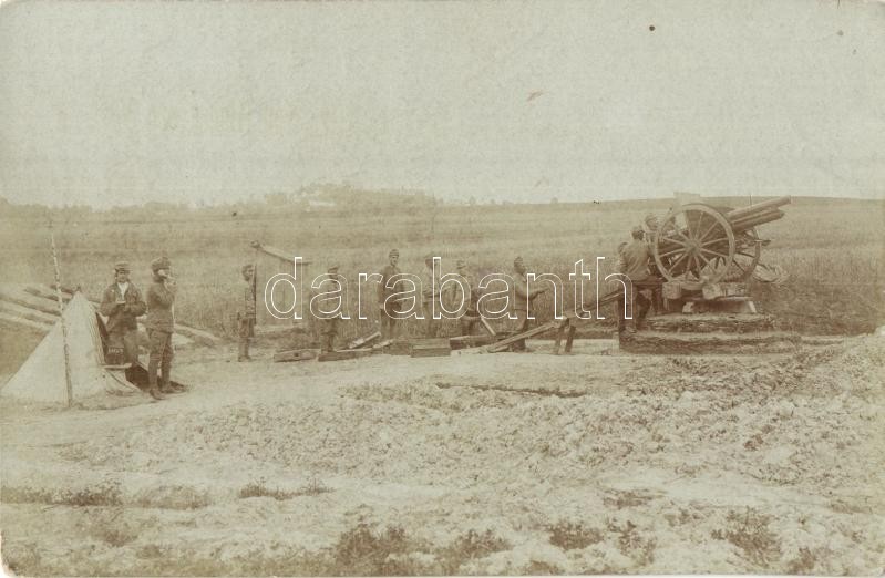 1916 Osztrák-magyar katonák kiemelt alapon álló ágyúval, rádióállomás sátorban / WWI K.u.K. military, cannon on raised base with radio station in the tent. photo + K.u.K. Infanterieregiment v. Hindenburg No. 69. 15. Feldkompagnie