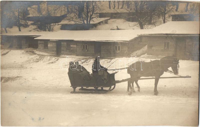 Leírás: 1917 Jassionov (Galícia), század konyhák, parancsnokok lószánon / WWI K.u.K. military, field kitchens and commanders in horse-sleigh. photo (fl)