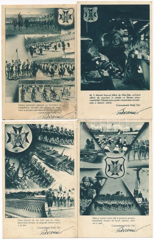 4 db RÉGI romániai katonai propaganda lap a Straja Tarii paramilitáris ifjúsági szervezetről. A lapokon a szervezet saját bélyege és bélyegzője, árusítani csak ezekkel lehetett / 4 pre-1945 Romanian military propaganda postcards of Straja Tarii paramilitary youth organization. The postcards have the organization's own stamps and stampers