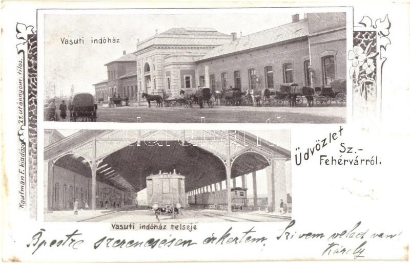 Leírás: 1900 Székesfehérvár, Vasúti indóház, vasútállomás, faszerkezetes váró vonatokkal. Kaufman F. kiadása, Art Nouveau (EK)