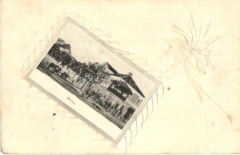 Leírás: 1910 Aszód, Fő tér, Weiner Dávid vendégfogadója, torony pavilon. Díszített képeslap (EK)
