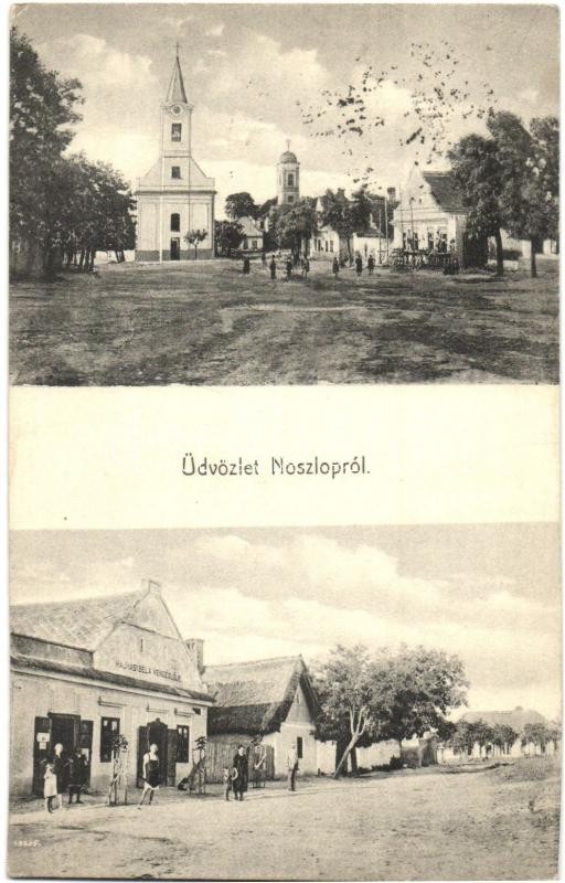 Leírás: 1931 Noszlop, tér templomok, utca, Hajmásy Béla vendéglője és saját kiadása