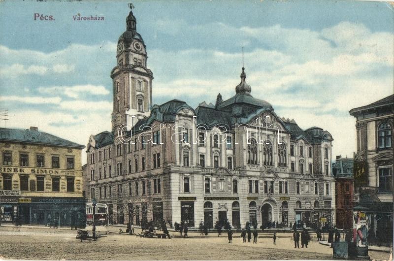 Leírás: Pécs, Városháza, Steiner S., Domján, Kovács Bernát, Paunz Jakab fia üzlete, Gyógyszertár, villamos. Karpf Berta kiadása (EK)