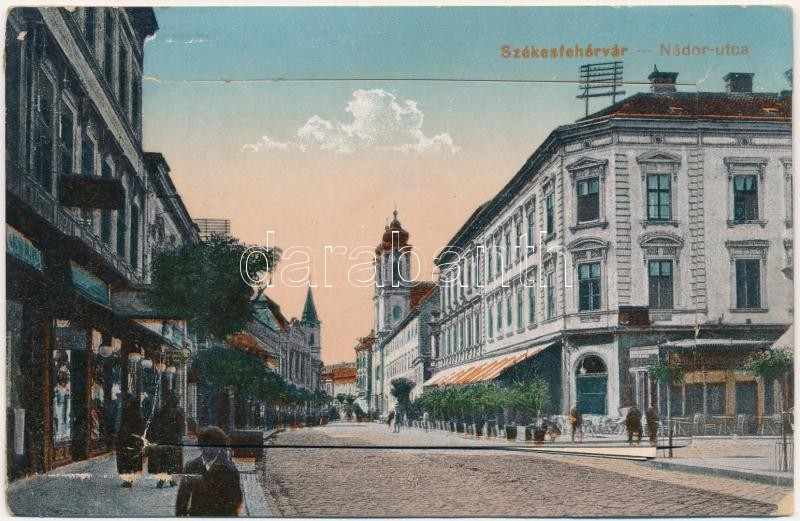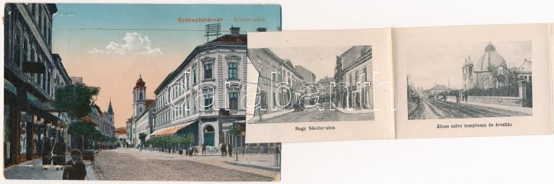 Székesfehérvár, Nádor utca, üzletek, kávéház. leporellolap, belül: Rákóczi utca, mozi, Nagy Sándor utca, Árpád fürdő, Megyeháza, Zichy liget, Vörösmarty tér, stb.