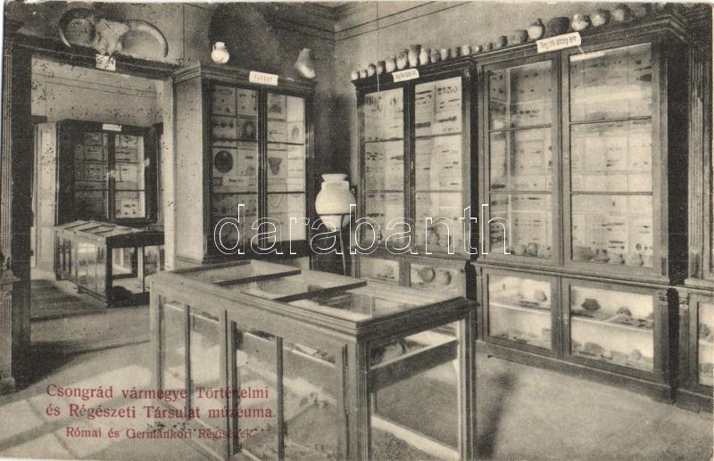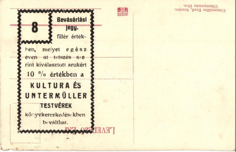 Szentes, Csongrád vármegyei történelmi és régészeti társulat múzeuma, római és germán-kori régiségek, belső. Untermüller Ernő kiadása. Hátoldalon Bevásárlási jegy 8 fillért értékben, beváltható Kultúra és Untermüller Testvérek könyvkereskedéseiben