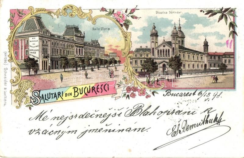 Leírás: 1898 Bucharest, Bukarest, Bucuresti; Baile Eforie, Biserica Sarindar / spa hall, Romanian Orthodox church. Schneider & Lux No. 1290. Art Nouveau, floral, litho (EK)