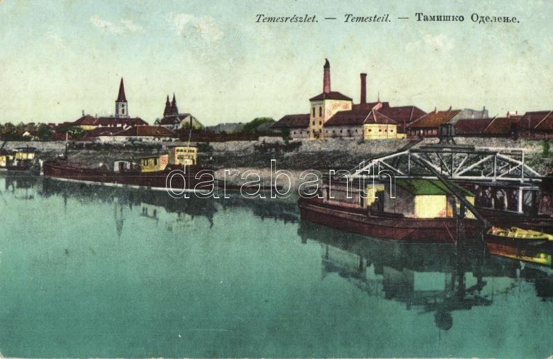 Leírás: Pancsova, Pancevo; Temes part uszályokkal, kiadja Kohn Samu / Timis River with barges