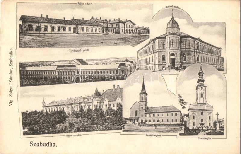 Szabadka, Subotica; Vasútállomás, Beltéri iskola, Törvényszéki palota, Barátok temploma, Szerb pravoszláv templom. Vig Zsigm. Sándor kiadása / railway station, school, court, church, Serbian Orthodox church. Art Nouveau