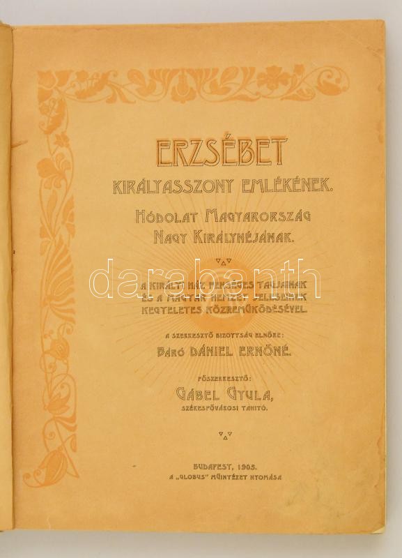 Erzsébet királyasszony emlékének. Hódolat Magyarország nagy királynéjának. A királyi ház fenséges tagjainak és a magyar nemzet jeleseinek kegyeletes közreműködésével. A szerkesztő bizottság elnöke: Dániel Ernőné. Főszerkesztő Gábel Gyula. Bp., 1905, Globus, 176 p. Gazdag szövegközti és egészoldalas képanyaggal. Kiadói aranyozott, festett egészvászon-kötésben, Gottermayer-kötésben, sérült, de javítható gerinccel
