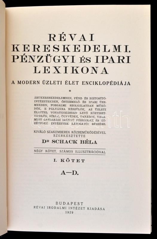 Révai kereskedelmi, pénzügyi és ipari lexikona. Szerk.: Schack Béla. 1... https://www.darabanth.com/hu/325-Gyorsarveres/325.0/Konyvek/Konyvek-Egyeb-ritkasagok~1000018/Revai-kereskedelmi-penzugyi-es-ipari-lexikona-Szerk-Schack-Bela-1-4-kot-Bp-1929-1931-~II1805997