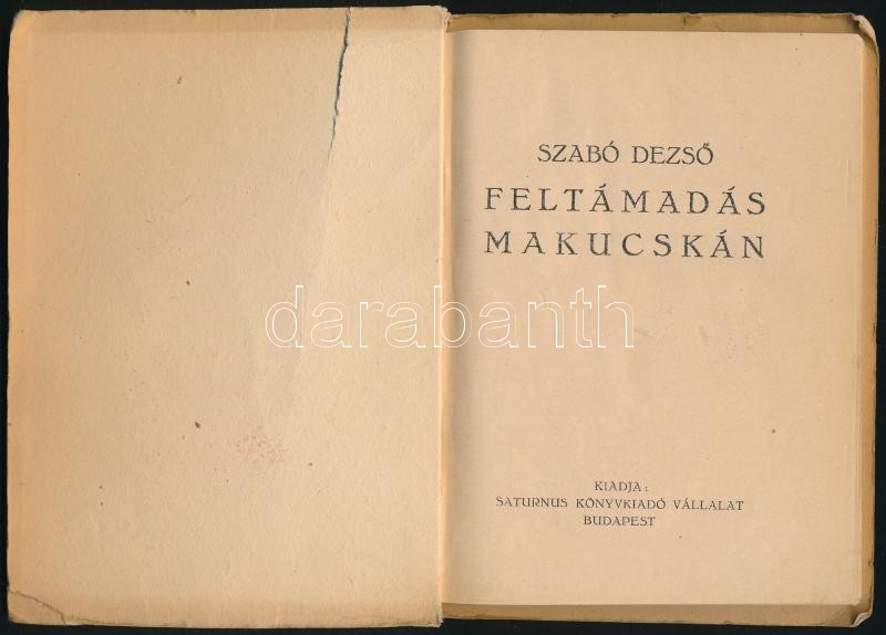 Szabó Dezső: Feltámadás Makucskán. Csanády György előszavával. Saturnus könyvek 2. Bp.,(1932),Saturnus, (Admiral-ny.), 128 p. Első kiadás. Kiadói papírkötés, szakadozott borítóval, de belül jó állapotban.