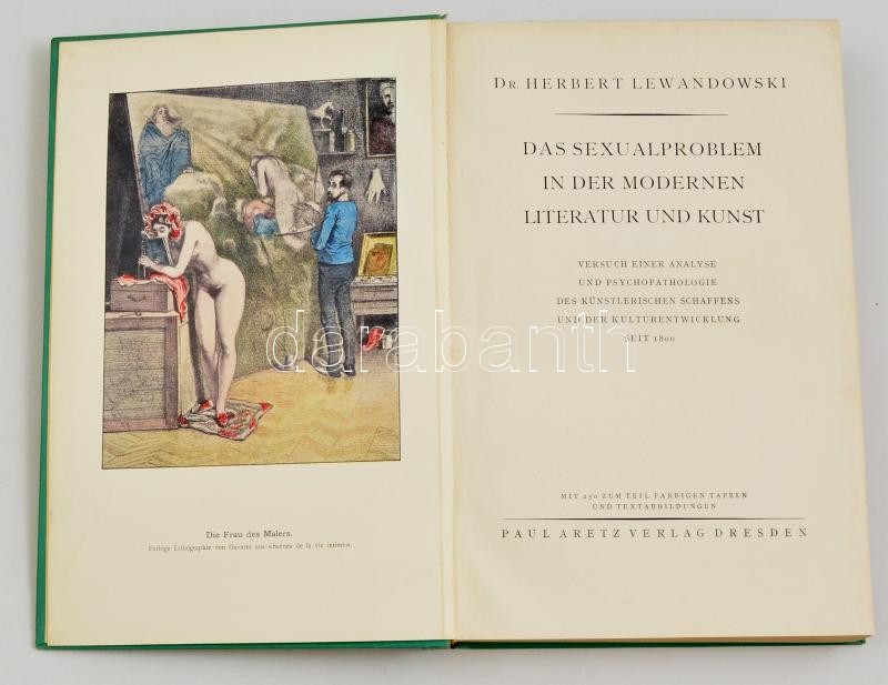 Dr. Herbert Lewandowski Das Sexualproblem in der Modernen Literatur und Kunst. Versuch einer Analyse und Psychopathologie des künstlerischen Schaffens und der Kulturentwicklung seit 1800. Dresden,1927,Paul Aretz, 361+1 p.+8 t. Gazdag képanyaggal illusztrálva, német nyelven. Kiadói aranyozott egészvászon-kötés, az egyik lap javított(211/212. oldal. )